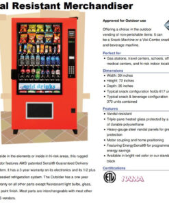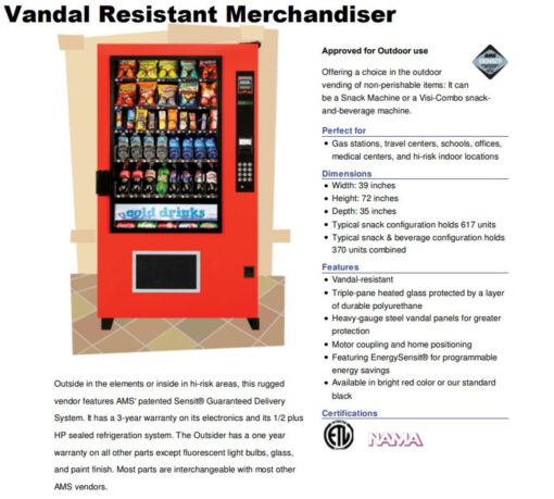 The AMS 39 Outdoor Snack and Bottle Vending Machine features 36 selections so you can vend a wide variety of items in a full sized glass front machine that is rated for outdoor use. Selection breakdown: 10 selections of wide snacks, 10 selections of candy bars and candy,and 16 bottled drinks. This is a true all-in-one combo vending machine!These 39-inch models are full-sized units and are great for high traffic locations such as schools, offices, medical centers, and hotels.