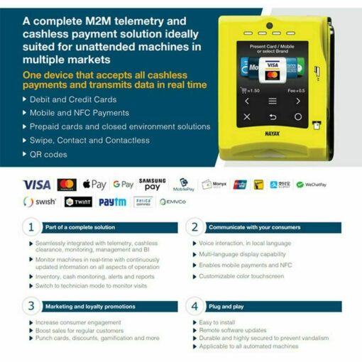 EXCLUSIVE: We include the state-of-the-art Nayax Touch Credit Card Reader with every AMS Vending Machine, making this vending machine Cashless out-of-the-box. The Nayax Touch will accept mobile payments such as Apple Pay and other NFC payment options.